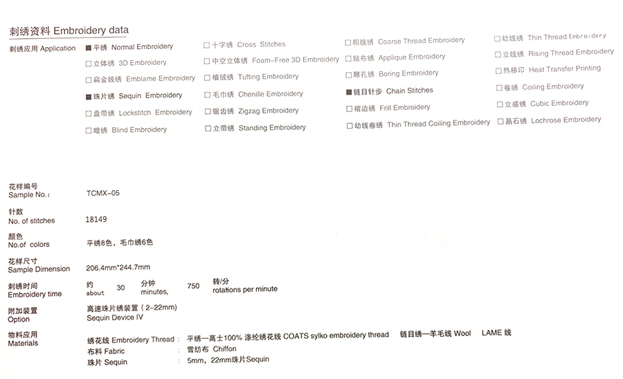 鏈目繡與珠片繡、平繡的完美結合,5mm及22mm大型珠片刺繡,鏈目繡中采用了3種特殊線材(淡雅的羊毛線、炫麗的LAME線、光彩奪目的金屬線) ,從而勾勒出五彩繽紛的花朵,豐富了設計,提升了產品的附加值。