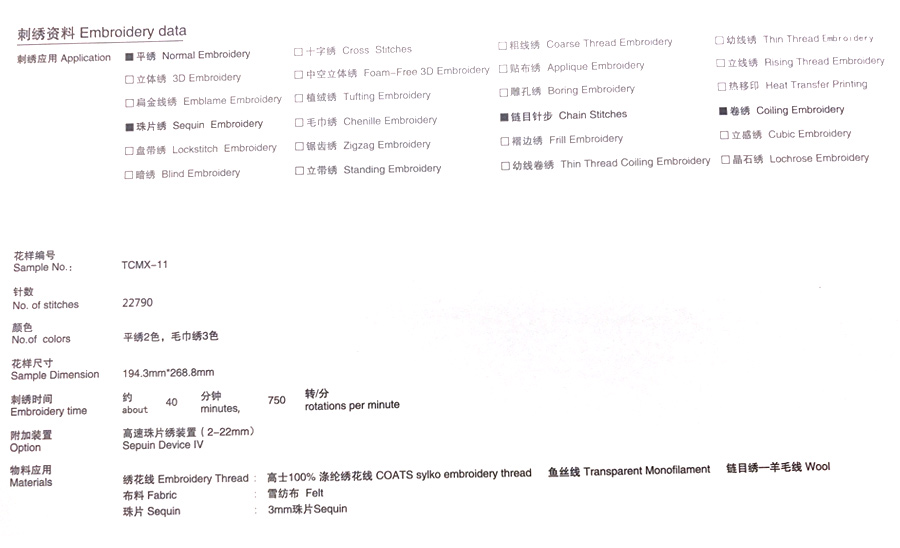 卷繡所帶來的立體感細致而立體,在制作卷繡時通過選用芯線及包線的顏色來搭配設計,芯線和包線的空間比例有四種可供選擇,高精準的卷繡裝置可做出精致的立體包邊效果,為繡花添加更多設計元素。