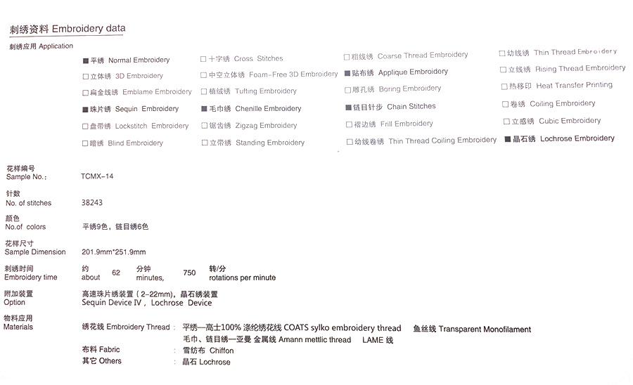 平繡、鏈目繡、毛巾繡、珠片繡、貼布繡及晶石繡,真正做到六合的刺繡效果。 平繡機頭上9色及特種繡6色,整幅設計運用了15種顏色并附加奢華的晶石,用機器刺繡代替傳統的手縫石工藝,大大提高了生產效率,提升了產品的附加值。
